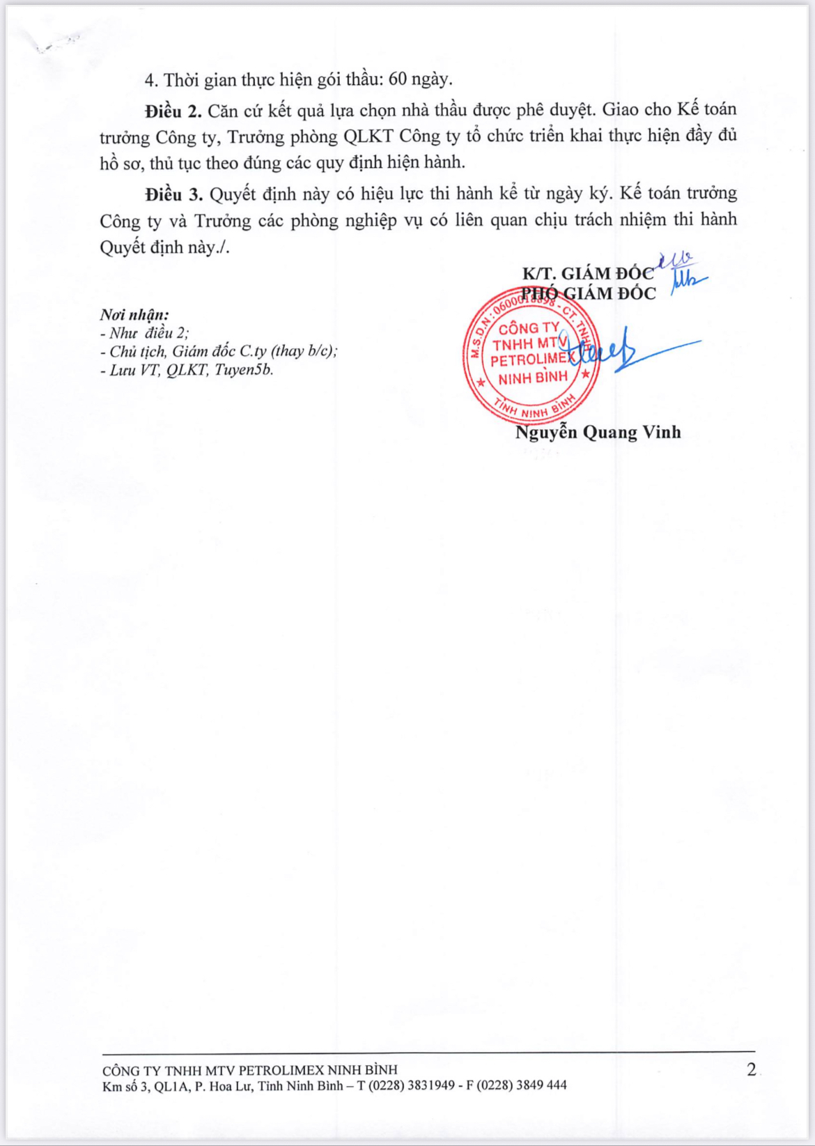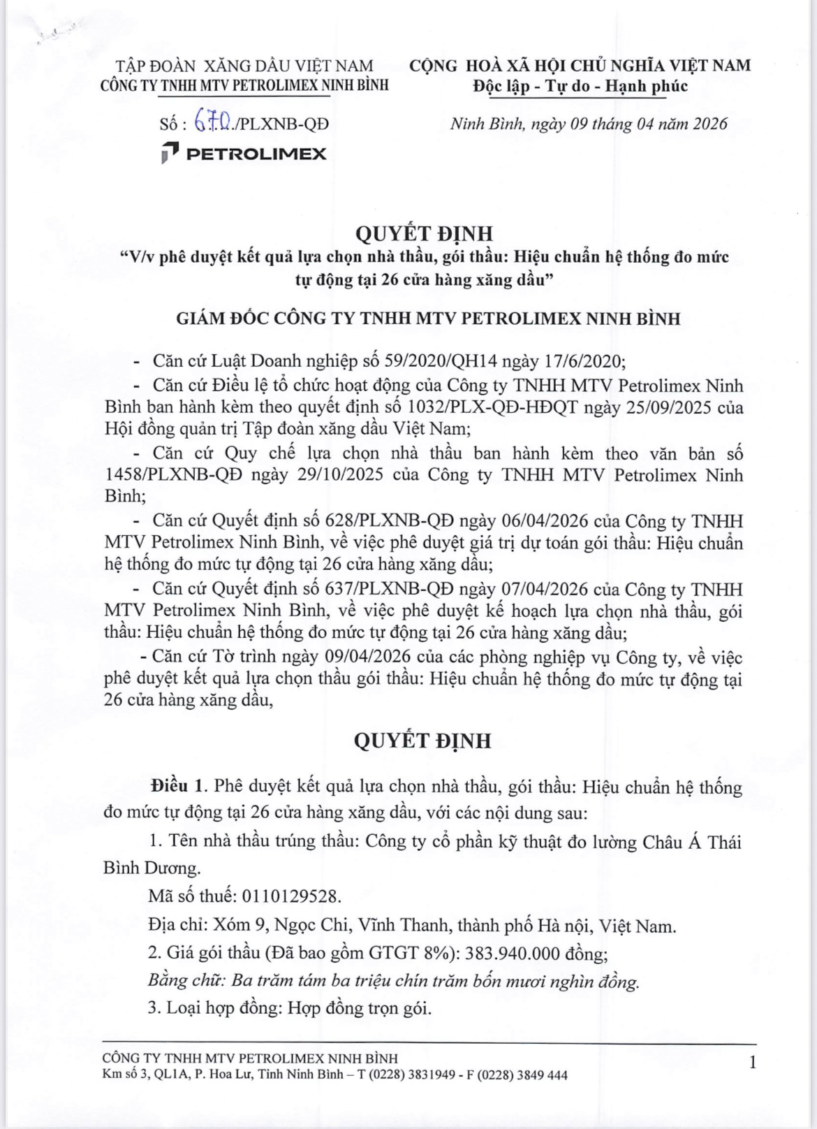 Công ty TNHH MTV Petrolimex Ninh Bình thông báo kết quả lựa chọn nhà thầu, gói thầu: Hiệu chuẩn hệ thống đo mức tự động tại 26 cửa hàng xăng dầu; giá trúng thầu: 383.940.000 đồng.