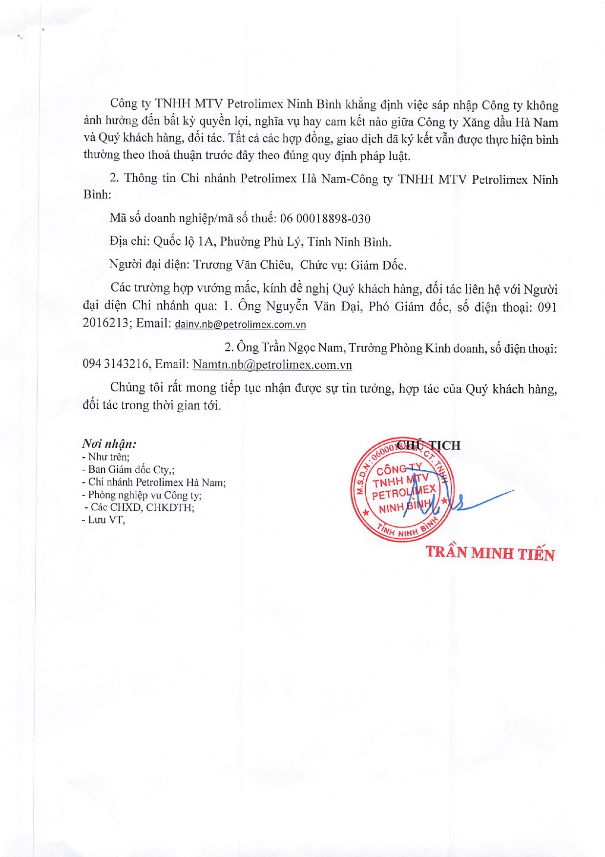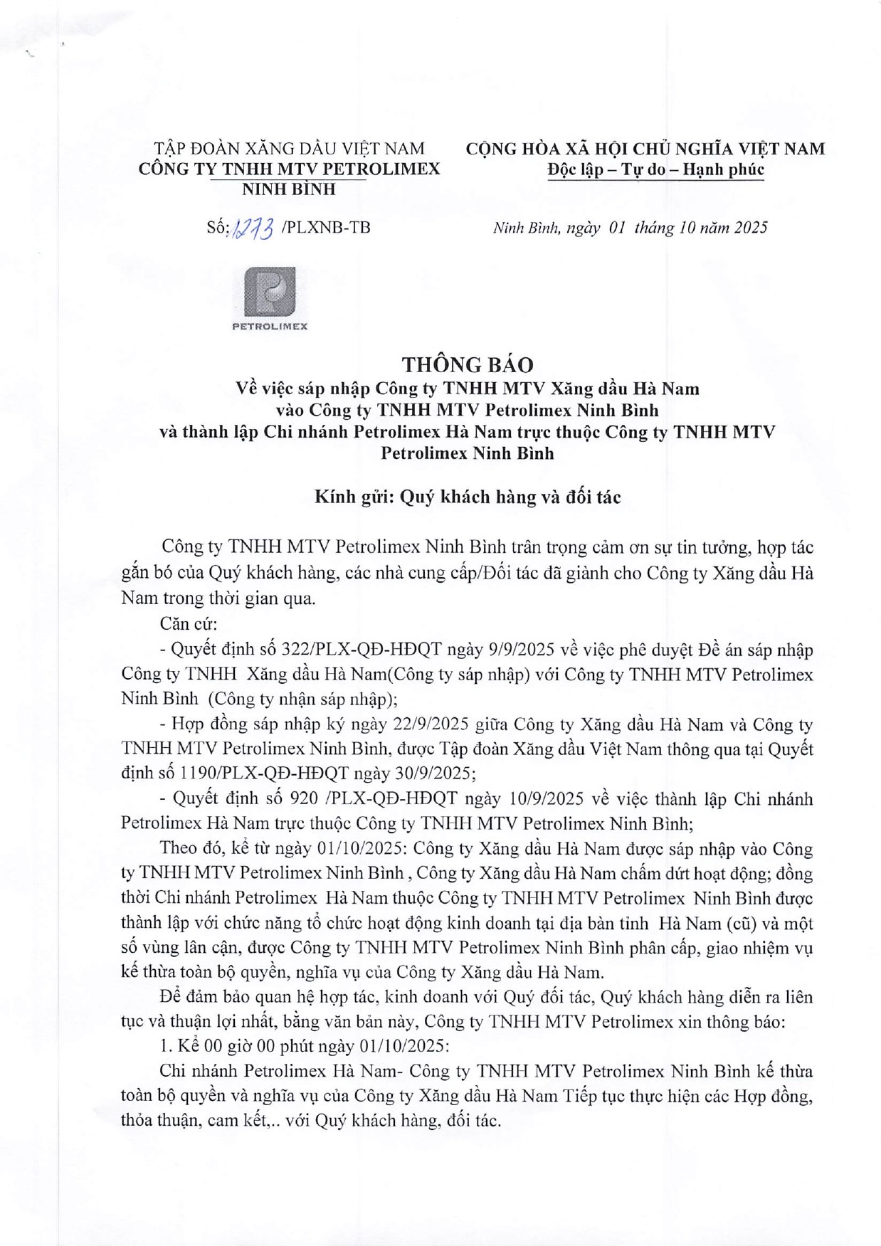 Thực hiện chủ trương của Tập đoàn Xăng dầu Việt Nam, từ ngày 01/10/2025, Công ty TNHH MTV Xăng dầu Hà Nam chính thức sáp nhập vào Công ty TNHH MTV Petrolimex Ninh Bình và thành lập Chi nhánh Petrolimex Hà Nam trực thuộc Công ty TNHH MTV Petrolimex Ninh Bình.